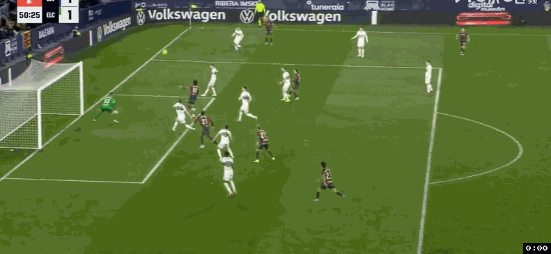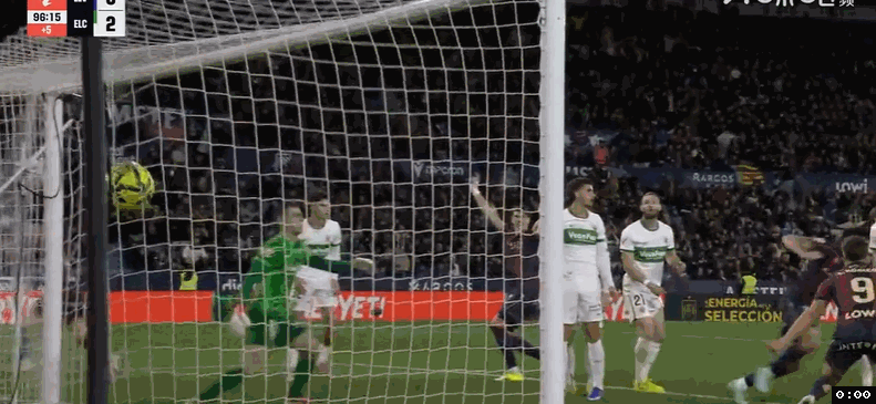 之后两队一顿闷战,直到尾声阶段再迎来高潮,第82分钟,埃尔切左路快速反击,瓦莱拉突到禁区边上兜传禁区中路,曼特孔点球点右侧抢点头球摆渡做球,博亚尔抢到第2落点凌空倒挂金钩,皮球应声入网,埃尔切2:2扳平比分。然而埃尔切并未能抢到1分,补时最后1分钟,莱万特右侧角球机会,奥拉萨加斯蒂操刀主罚兜传门前,马图罗人群中高高跃起抢点强力头槌攻门,皮球直入网窝,莱万特3:2压哨绝杀埃尔切。