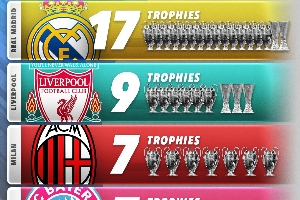 1、皇马,17冠(15欧冠+2欧联)